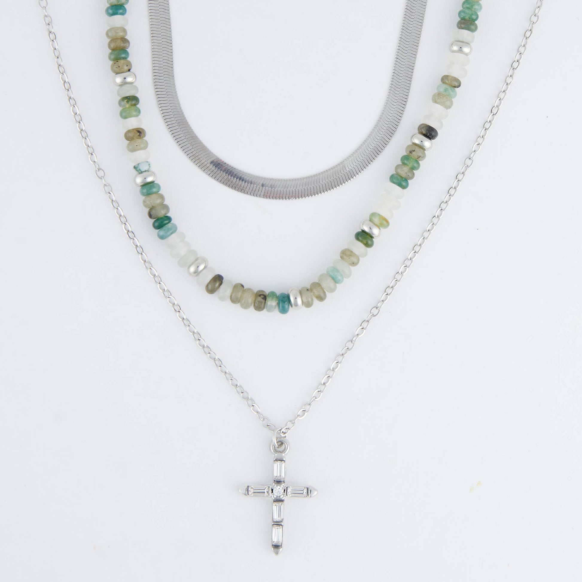 Elevate your everyday look with the Eliana Beaded Layered Cross Necklace. Featuring three perfectly coordinated layers—including a delicate herringbone chain, a strand of multi-colored or earth-toned beads, and a sparkling baguette cross pendant—this necklace blends faith and fashion with ease. Designed for versatility and layered charm, it’s an effortless statement piece whether worn alone or paired with your favorite chains. Available in gold or silver tones to suit your personal style.