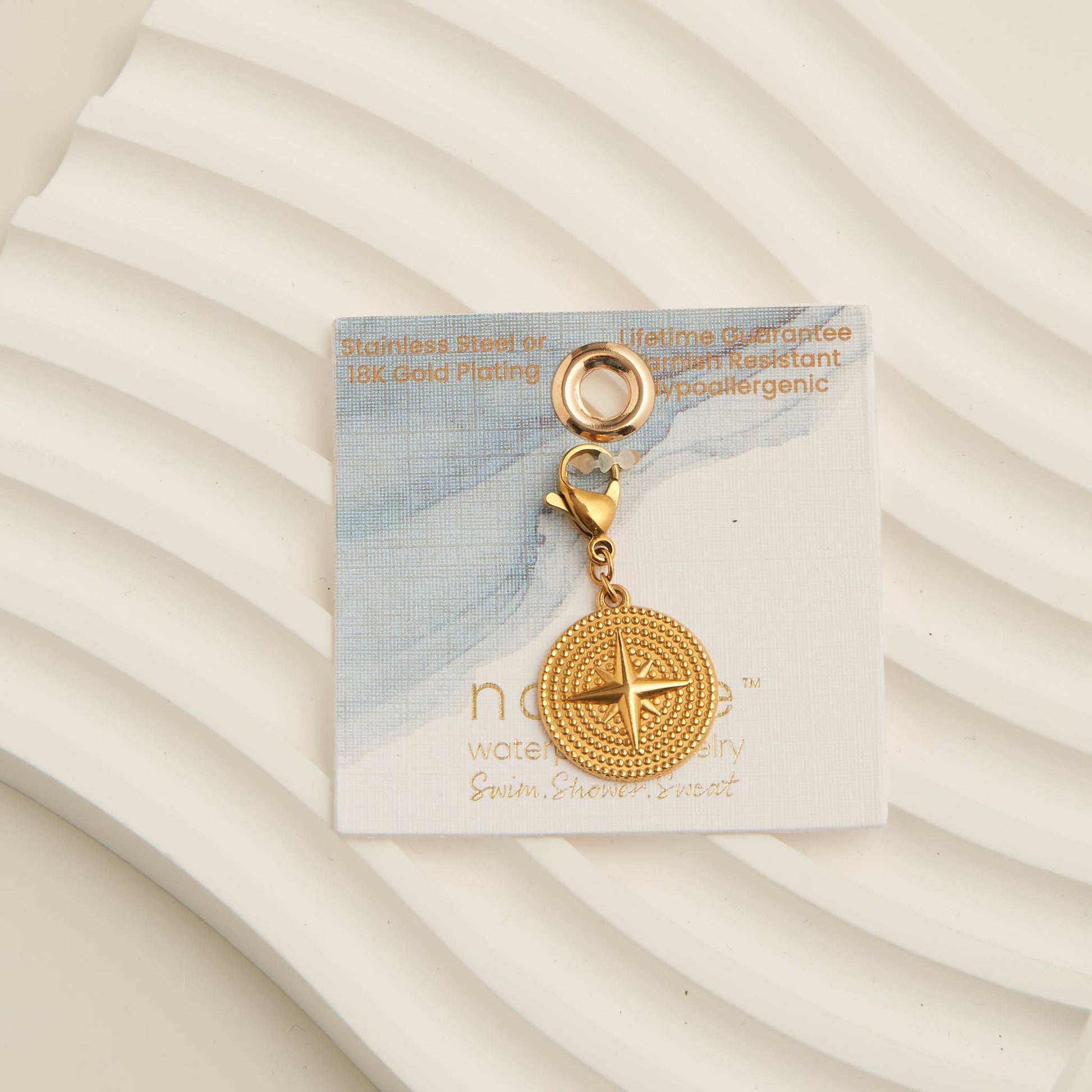 Bold and meaningful, the Narelle Gold Compass Charm is a symbol of direction, guidance, and inner strength. This richly detailed charm features a raised compass star centered on a textured medallion, finished in radiant 18K gold plating. With a secure lobster clasp, it clips easily onto chains, bracelets, or hoops—making it ideal for personalizing your favorite jewelry pieces. Protected with our signature waterproof, tarnish-resistant PVD coating, it’s made to withstand everyday wear while shining with purpose. A striking statement charm to inspire your journey—wherever it leads.