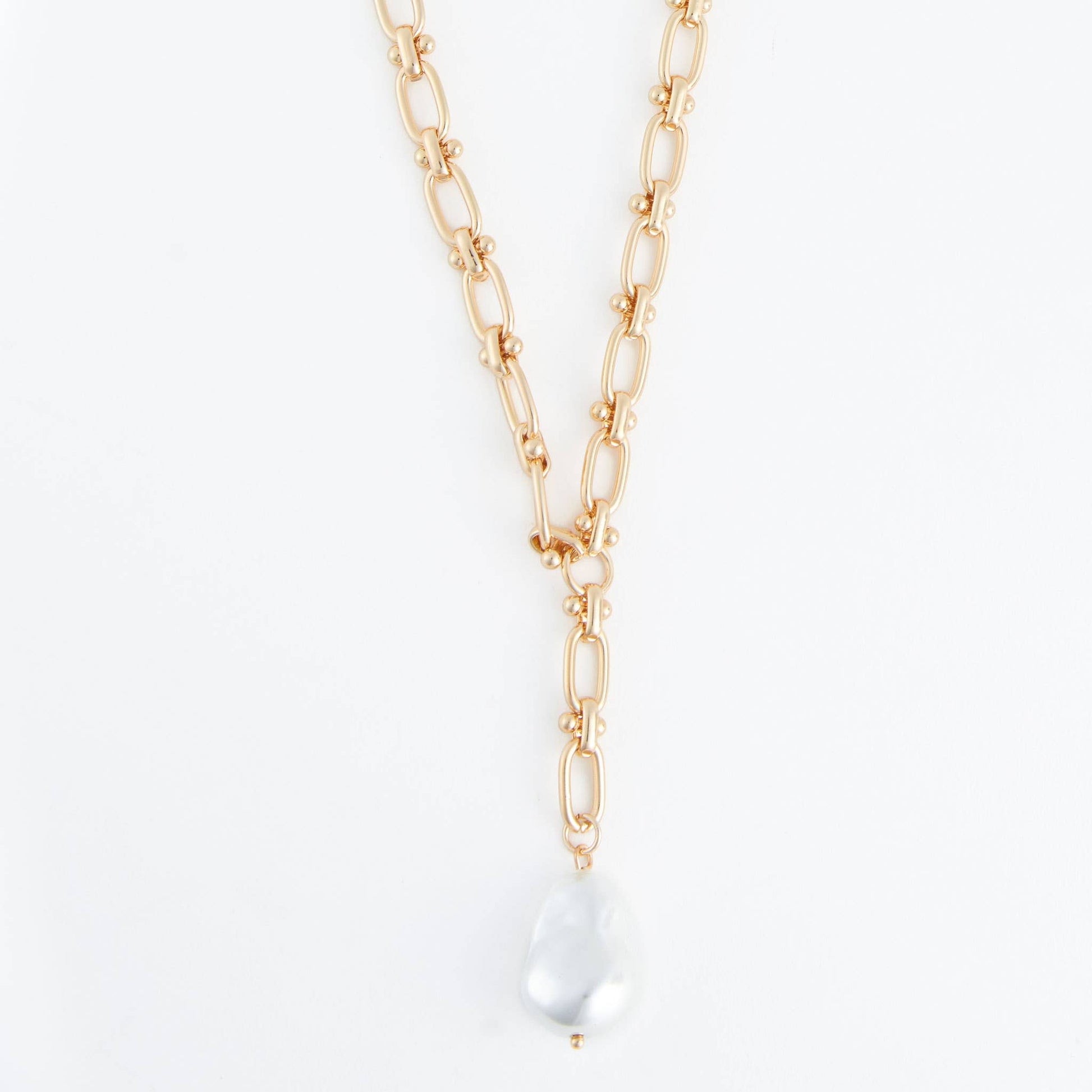 Elevate your everyday elegance with the Renee 18" Genuine Freshwater Pearl Chunky Gold Pendant Y-Necklace — a striking balance of bold sophistication and timeless charm. This necklace features a chunky gold chain accented with an organic-shaped genuine freshwater pearl, uniquely formed for natural beauty and luminous texture. The Y-shaped design draws the eye with a single statement pearl drop pendant that enhances any neckline with refined grace. Measuring 18" in length, the Renee Necklace rests perfectly at the collarbone, making it ideal for layering or wearing solo as a focal piece. Its rich gold tone and sculptural links lend a touch of modern luxury, while the genuine pearl introduces a classic touch that never goes out of style. Whether paired with casual knits or evening attire, this necklace brings effortless polish and contemporary femininity to any look — a must-have accessory that radiates understated confidence.