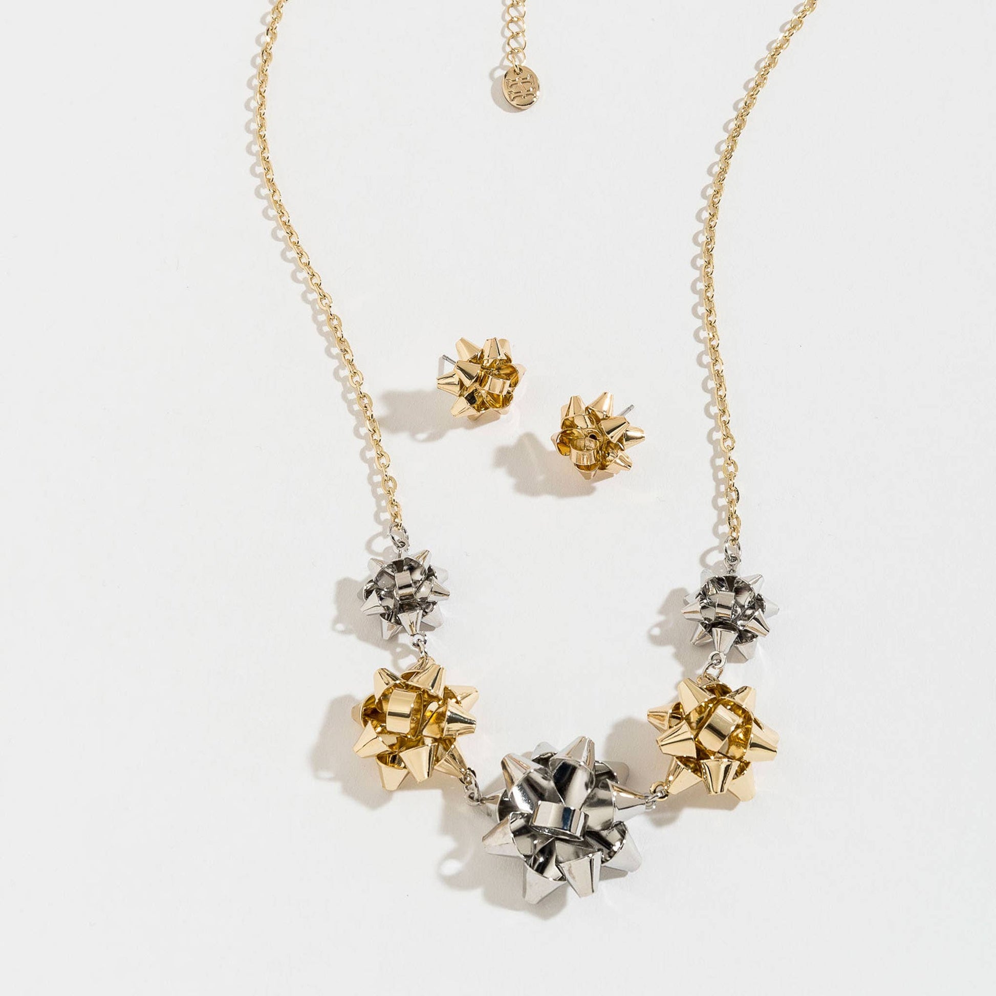 Embrace the Christmas spirit with this Gift Bow Collar Necklace and Earring Set. It's the perfect gift for December birthdays, Christmas, stocking stuffers, etc. These whimsical Christmas bow necklace and earrings are dainty, nickel-free and comfortable to wear!